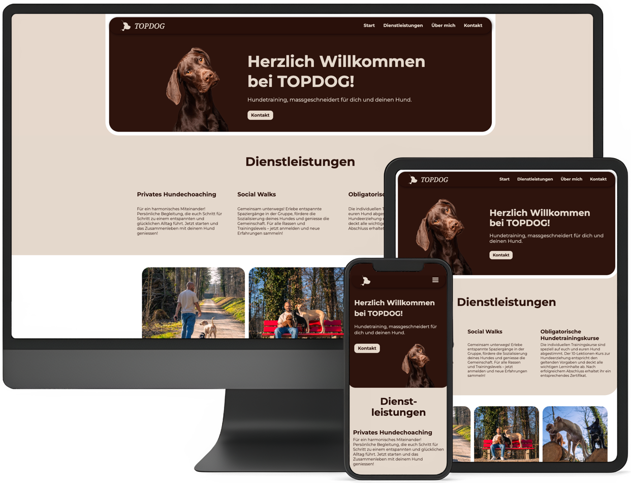 Für TOPDOG durften wir die neue Webseite umsetzen – inklusive Fotoshooting. Das Ziel: Eine klare, persönliche Webseite, die das Angebot von Luca Negreira als Hundecoach verständlich und sympathisch vermittelt. Luca begleitet Hunde schon fast sein ganzes Leben. Seine beiden eigenen, Bueno und Odin, hat er aus dem Tierschutz übernommen. Mit viel Erfahrung, Empathie und einer fundierten Ausbildung unterstützt er Mensch und Hund dabei, ein eingespieltes Team zu werden. Design, Text und Bilder haben wir gemeinsam mit Luca entwickelt. Besonders das Fotoshooting war eine spannende Herausforderung, denn mit Hunden zu arbeiten, ist definitiv anders als mit Menschen. Geduld, Ruhe und der richtige Moment waren entscheidend. Ein Hund lächelt schliesslich nicht automatisch, nur weil man „Spaghetti“ sagt. Jetzt ist alles online – und sowohl er als auch wir sind mehr als zufrieden mit dem Ergebnis.